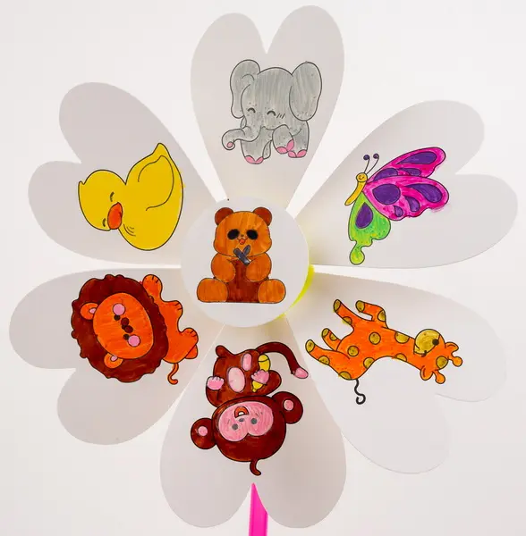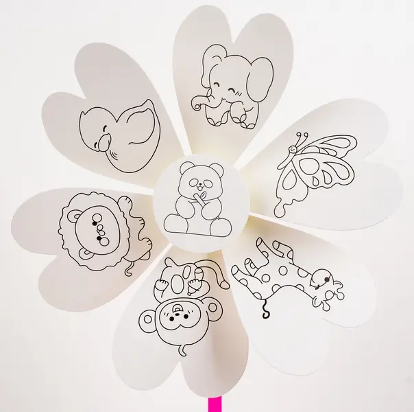 papierový veterník so šablónou na maľovanie, stredové koliesko, tyčka, celková dĺžka zloženého veterníka 38,5 cm