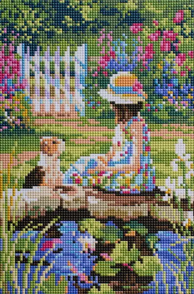 samolepiaca predloha so znakovou schémou, predloha je natiahnutá na drevenom ráme, rozvíja trpezlivosť, sada obsahuje predlohu, akrylové kamienky, rozdelené podľa farieb odpovedajúcich znakovej schéme, plastovou nádobtu pre ľahšiu manipuláciu s kamie