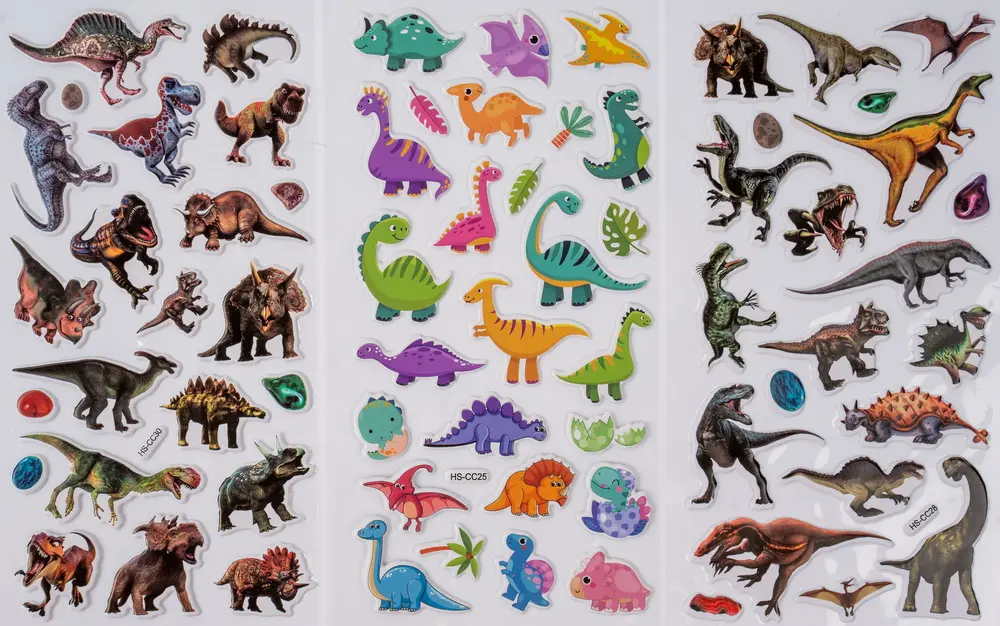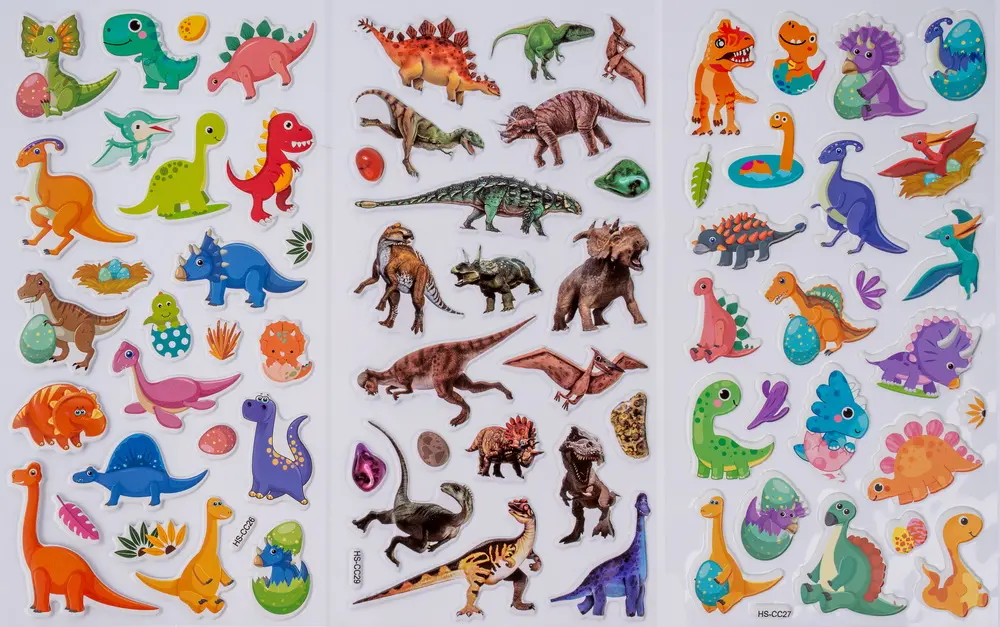 Ide o balenie 6 hárkov plastických samolepiek s motívom dinosaurov. Každý hárok má rozmer 10 x 22 cm. Samolepky majú konvexný tvar, čo im dodáva 3D efekt. Veľkosť samolepiek je od 1,8 do 4 cm. Sú ideálne na zdobenie zošitov, denníkov, albumov, alebo na kreatívne tvorenie.