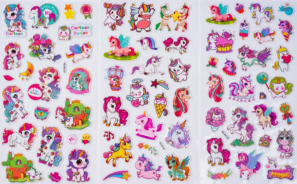 Ide o balenie 6 hárkov plastických samolepiek s motívom jednorožcov. Každý hárok má rozmer 10 x 22 cm. Samolepky majú konvexný tvar, čo im dodáva 3D efekt. Veľkosť samolepiek je od 1,8 do 4 cm. Sú ideálne na zdobenie zošitov, denníkov, albumov alebo na kreatívne tvorenie.