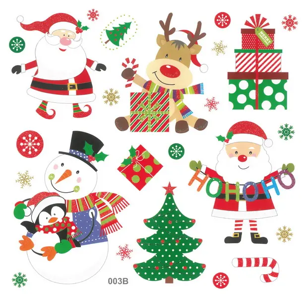 Ide o hárok s 9 papierovými samolepkami s veselými vianočnými motívmi. Motívy zahŕňajú centrálnu postavu Santa Clausa v bodkovanom prevedení, veselého snehuliaka s tučniakom, soba s darčekom, veľký vianočný stromček a stohy darčekových krabičiek s bodkami a pruhmi. Scéna je doplnená cukrovými palicami a snehovými vločkami s glitrami. Samolepky majú glitrový efekt pre slávnostný vzhľad. Sú ideálne na dekoráciu balíčkov, vianočných prianí, denníkov alebo na zimné tvorenie. Rozmer celého hárku je 18 x 19 cm a veľkosť jednotlivých samolepiek sa pohybuje od 2 do 9 cm.