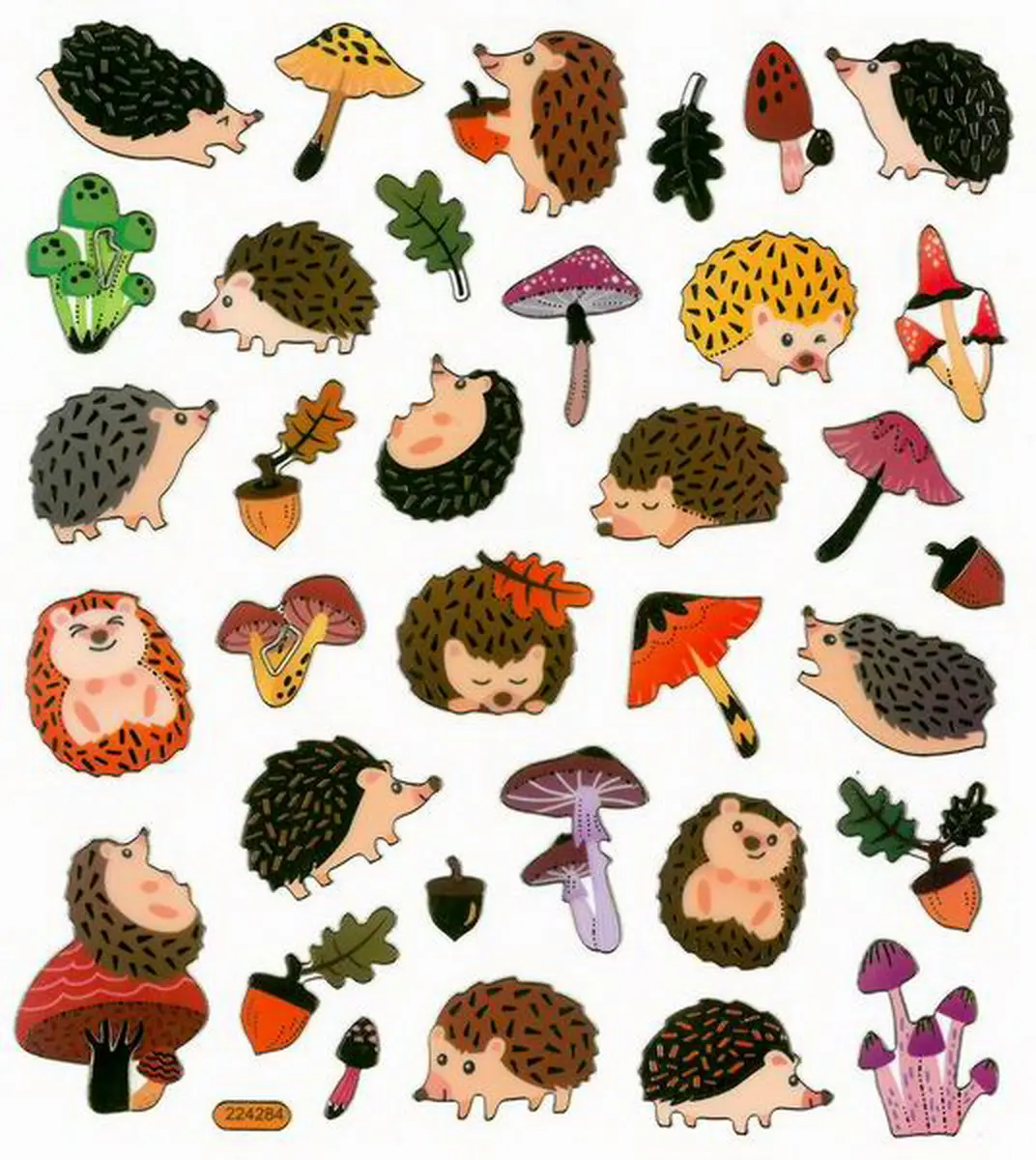 Papierové samolepky s motívom ježkov a húb sú obsiahnuté v sade 34 kusov. Jednotlivé samolepky majú veľkosť približne 3 cm a sú umiestnené na hárku s rozmerom 15 x 17 cm. Sú ideálne na dekoráciu prianí, darčekov, denníkov, fotoalbumov, scrapbookingových projektov a ďalších kreatívnych výtvorov.