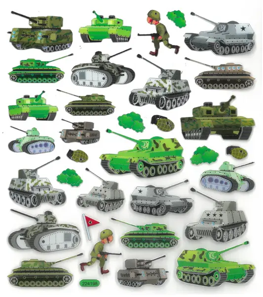 Papierové samolepky s motívom tankov sú obsiahnuté v sade 33 kusov. Nájdeme tu tanky v rôznych farbách a vyhotoveniach. Veľkosť jednotlivých samolepiek je približne 3 cm a sú umiestnené na hárku s rozmerom 15 x 17 cm. Sú ideálne na dekoráciu prianí, darčekov, denníkov, fotoalbumov, scrapbookingových projektov a ďalších kreatívnych výtvorov.
