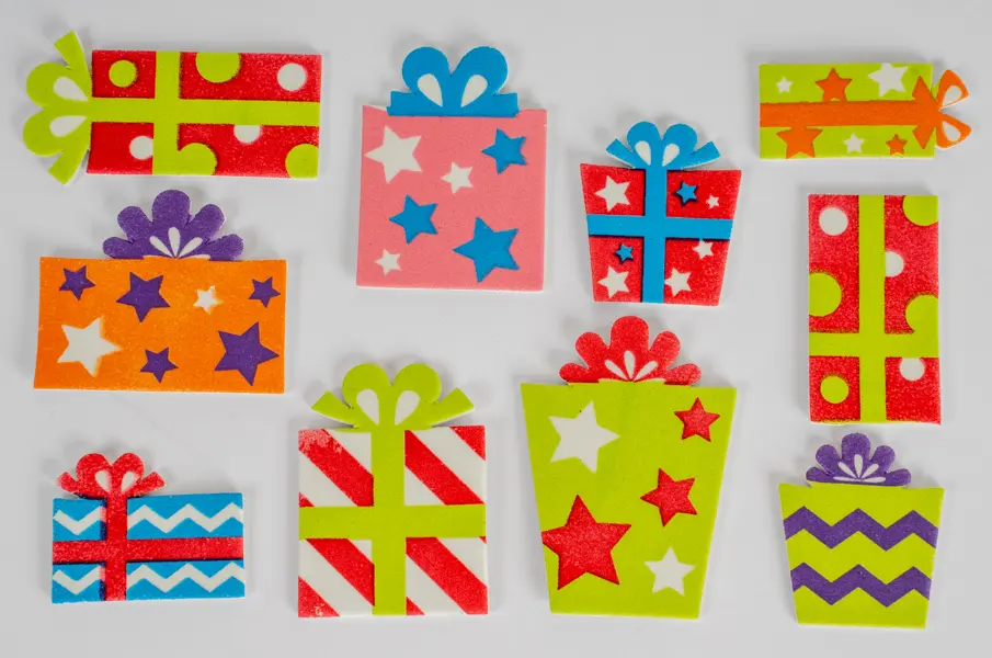 Penové samolepky s motívom darčekov sú obsiahnuté v balení 28 kusov. Nájdeme tu mix rôzne farebných a zdobených darčekových krabičiek s mašľami. Veľkosť jednotlivých samolepiek sa pohybuje od 2 cm do 4 cm, hrúbka je 2 mm. Tieto samolepky sú ideálne na dekoráciu prianí, darčekov, denníkov, fotoalbumov, scrapbookingových projektov a ďalších kreatívnych výtvorov.