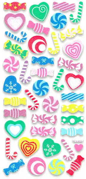 Penové trblietavé samolepky s motívom cukríkov sú obsiahnuté v balení 42 kusov. Nájdeme tu rôzne druhy cukríkov, lízatiek a vianočných palíc v pestrých farbách. Veľkosť jednotlivých samolepiek je približne 3 cm, hrúbka je 2 mm. Tieto samolepky sú ideálne na dekoráciu prianí, darčekov, denníkov, fotoalbumov, scrapbookingových projektov a ďalších kreatívnych výtvorov.