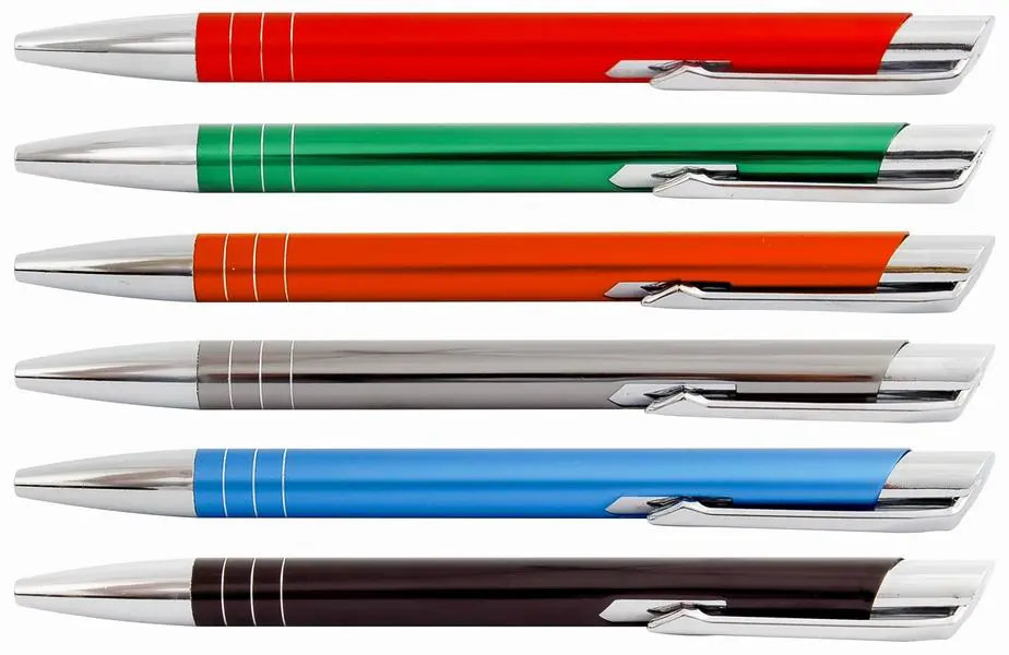 kovové guľočkové pero, stláčací mechanizmus, vymeniteľná náplň F-Parker plast, modrý atrament, šírka stopy 0,7 mm