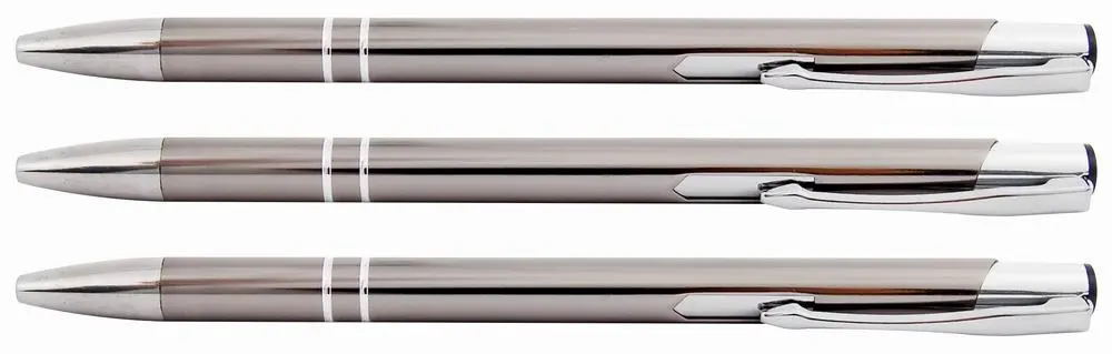 kovové guľočkové pero, stláčací mechanizmus, strieborné doplnky, vymeniteľná náplň F-411, modrý atrament, šírka stopy 0,7 mm