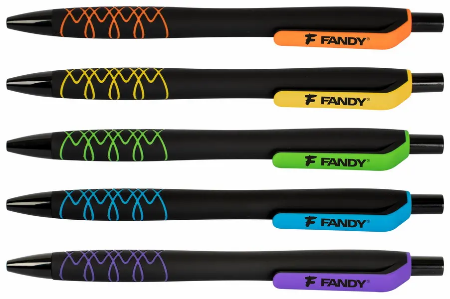 plastové kuličkové pero, stiskací mechanismus, pogumované tělo pro velmi příjemné v držení, vyměnitelná náplň F-411, modrý inkoust, šíře stopy 0,7 mm, mix barev