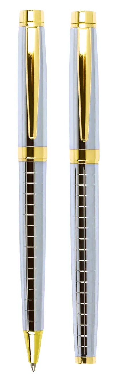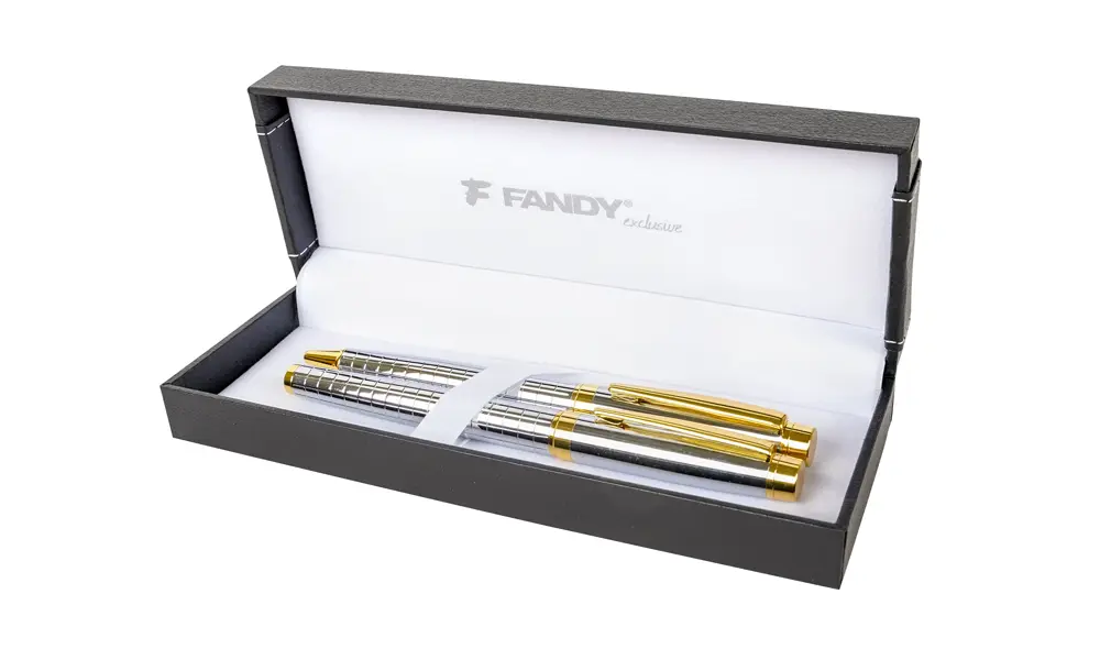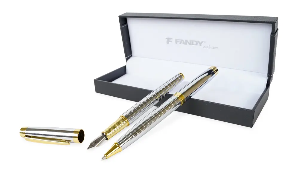 súprava kovového guľočkového a plniaceho pera, guľočkové pero otočný mechanizmus, plniace pero s viečkom, vymeniteľná náplň F-Parker, širka stopy 0,7 mm (guľočkové pero), atramentové bombičky (plniace pero), modrý atrament, luxusná darčeková krabička