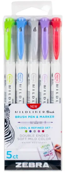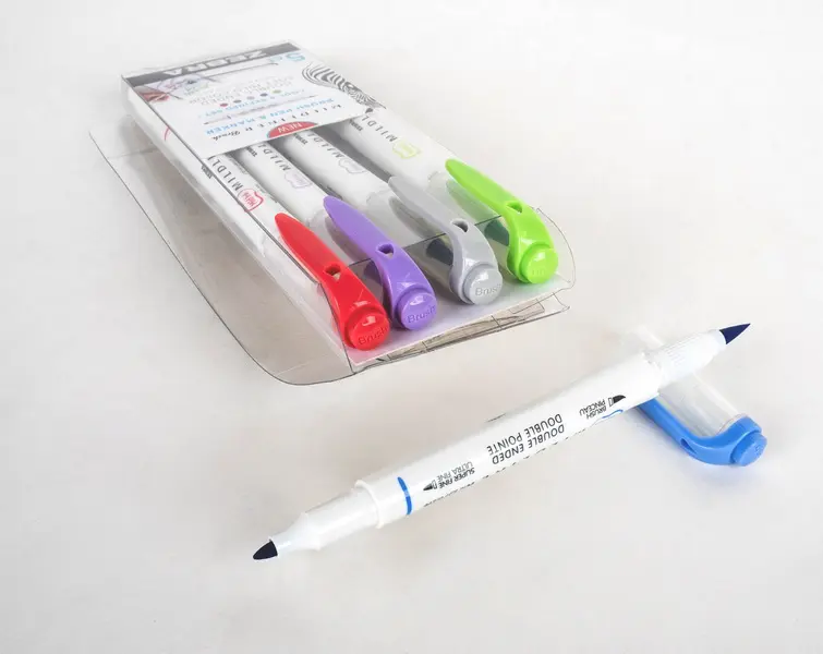 sada 5 farebných obojstranných popisovačov v slim prevedení, na jednej strane je tenký hrot pre úzke linky, na druhej strane je skosený hrot pre silnejšie ťahy, vodeodolný atrament bez obsahu kyselín