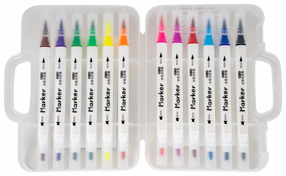 sada 12 obojstranných popisovačov v elegantnom plastovom puzdre s rukoväťou, štetcový (3,2 mm) a skosený (3,5 mm) hrot, jasné farby, štvorcový profil tela, atrament na vodnej báze