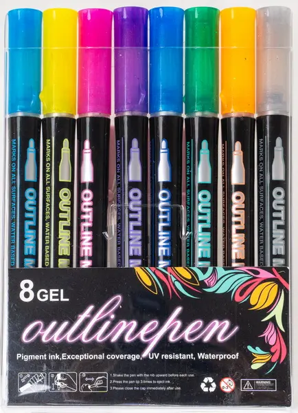 sada 8 metalických popisovačov s dvoma farebnými čiarami a striebornou vnútornou stopou, vláknový hrot so stopou 3 mm, pigmentový atrament, UV a vodeodolný, na rôzne povrchy - kartón, sklo, keramika, plátno, drevo, koža, kamienky, plast
