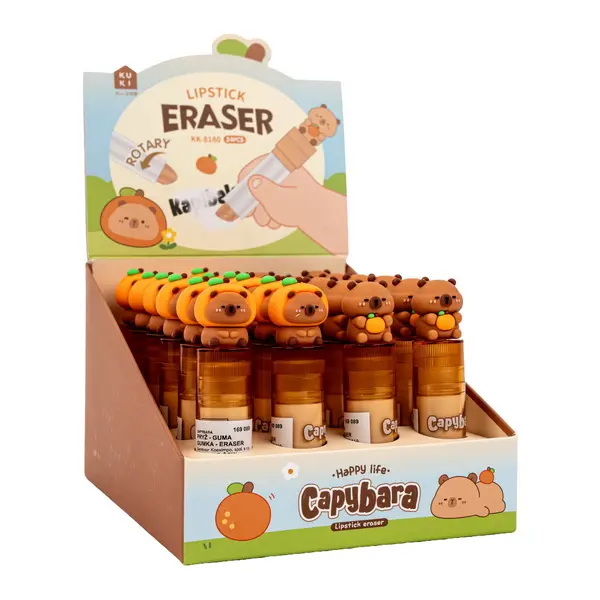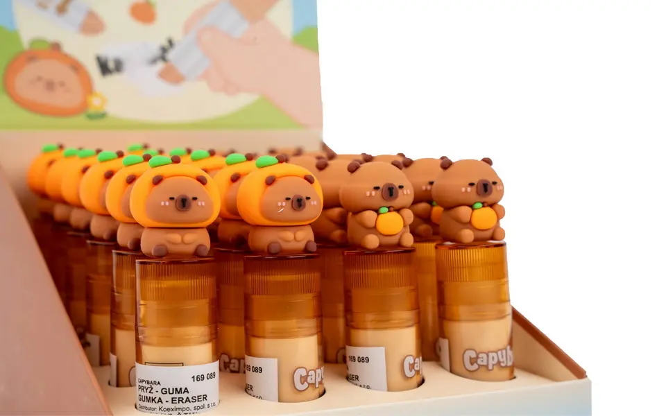 Ide o praktickú a hravú gumu (pryž) s motívom kapybary. Guma má dizajn v tvare rúžu (vysúvacieho aplikátora). Guma sa vysúva otáčaním spodnej časti a zostáva vždy čistá. Je kompaktná s rozmermi cca 9 x 2 cm. Je dodávaná v mixe motívov a je ideálna pre školákov.