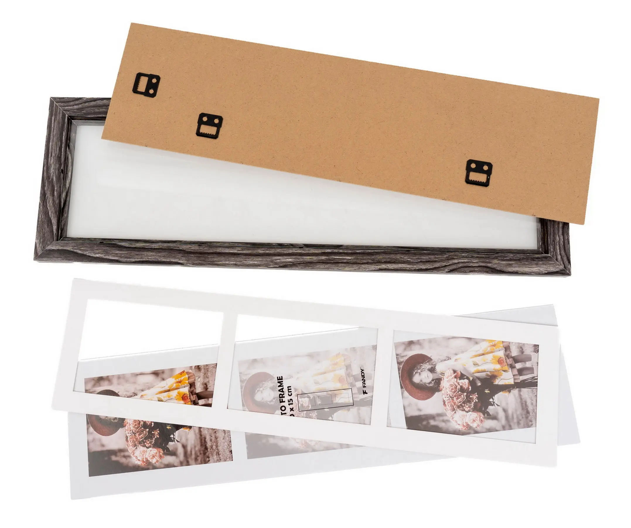 Pripomínajte si svoje najkrajšie okamihy s týmto fotorámikom Narvik Gallery v dekore dreva. Sivo-hnedý MDF rámik vo vintage štýle je ideálny na tri fotografie s rozmermi 10 x 15 cm. Celý rámik má rozmer 18,5 x 56,5 cm, pričom šírka lišty je 2,8 cm. Rámik je určený na zavesenie na stenu vertikálne aj horizontálne. Fotografie sú chránené sklom a do rámika sa vkladajú jednoducho zo zadnej strany.