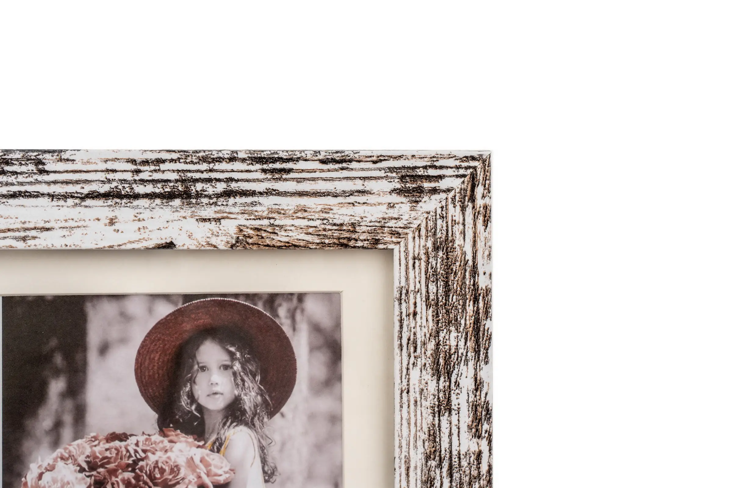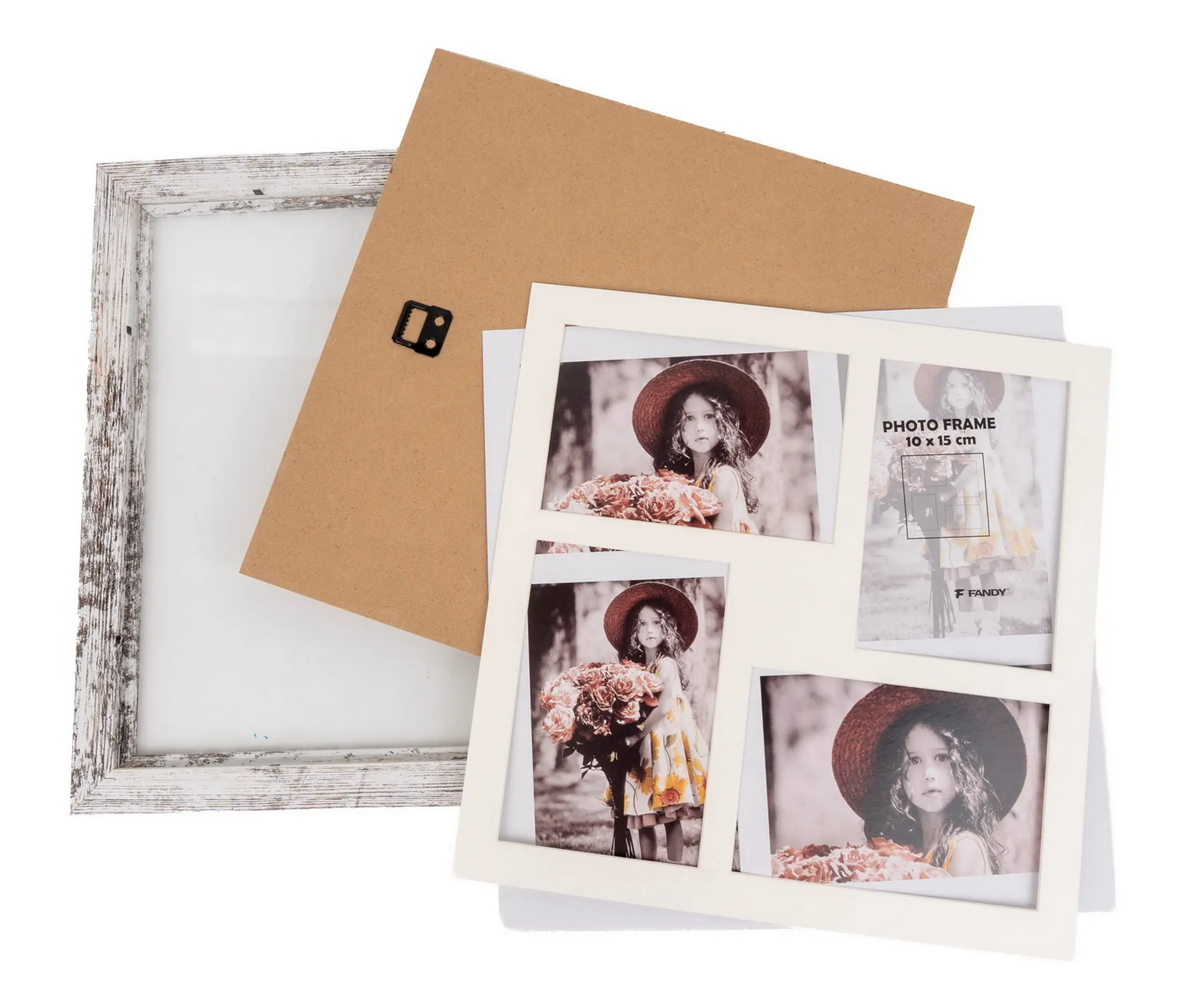 Pripomínajte si svoje najkrajšie okamihy s týmto fotorámikom Narvik Gallery v dekore dreva. Biely MDF rámik s melírom vo vintage štýle je ideálny na štyri fotografie – dve fotografie s rozmermi 10 x 15 cm a dve fotografie s rozmermi 15 x 10 cm. Bez pasparty je do rámika možné vložiť jednu fotografiu s rozmermi 30 x 30 cm. Celý rámik má rozmer 35 x 35 cm, pričom šírka lišty je 2,8 cm. Rámik je určený na zavesenie na stenu vertikálne. Fotografie sú chránené sklom a do rámika sa vkladajú jednoducho zo zadnej strany.