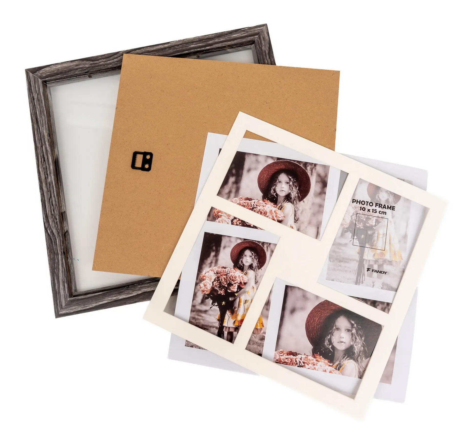 Pripomínajte si svoje najkrajšie okamihy s týmto fotorámikom Narvik Gallery v dekore dreva. Sivohnedý MDF rámik vo vintage štýle je ideálny na štyri fotografie – dve fotografie s rozmermi 10 x 15 cm a dve fotografie s rozmermi 15 x 10 cm. Bez pasparty je do rámika možné vložiť jednu fotografiu s rozmermi 30 x 30 cm. Celý rámik má rozmer 35 x 35 cm, pričom šírka lišty je 2,8 cm. Rámik je určený na zavesenie na stenu vertikálne. Fotografie sú chránené sklom a do rámika sa vkladajú jednoducho zo zadnej strany.