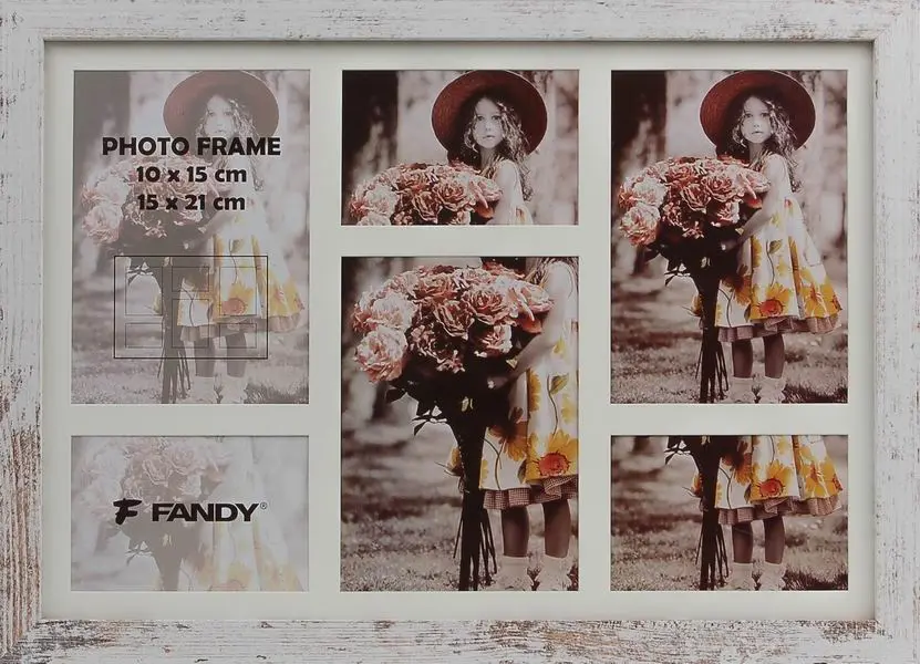 drevený rámček na 3 foto 10 x 15 cm a 3 foto 15 x 21 cm, rozmer rámčeka 56,5 x 41 cm, na zavesenie vertikálne i horizontálne, šírka lišty 2,8 cm, fotografia je krytá sklom