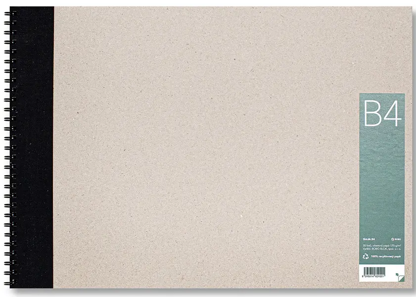 30 listů • pevné desky - vyrobeny ze 100% sběrového papíru • ozdobené černým knihařským plátnem • bílý recyklovaný papír Ecoline • gramáž 170 g/m² • certifikace FSC® a Blue Angel • boční kroužková vazba TWIN WIRE