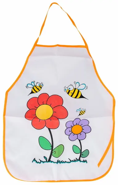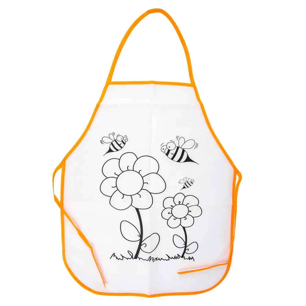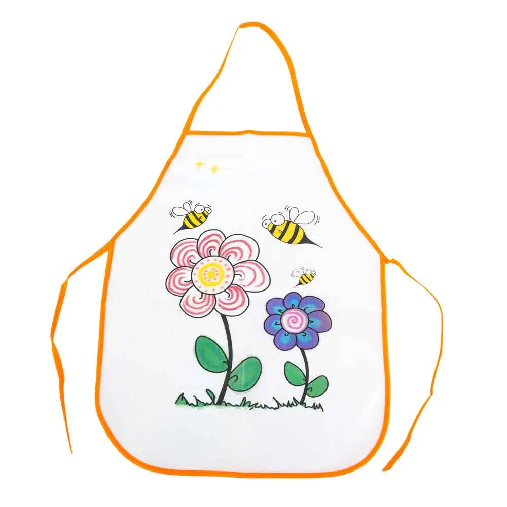 Jedná se o zástěrku o rozměrech 38 x 47 cm, která je určená na výtvarnou výchovu a je opatřena předlohou pro vymalování s motivem květin a včel. Tato zástěrka je ideální ochranou oblečení při malování, kreslení a jiných kreativních činnostech ve škole i doma. Děti si mohou motiv vymalovat podle své fantazie. Zástěrka má šňůrky a lemování v oranžové barvě.